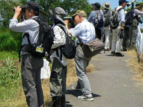 気温30度を超す中、19名の参加者をお迎えしての探鳥会でした。前浜へ向かう途中、 セッカの声を聞きながら中洲でカニ類をチェックします。 今後の探鳥会の予定はこちら