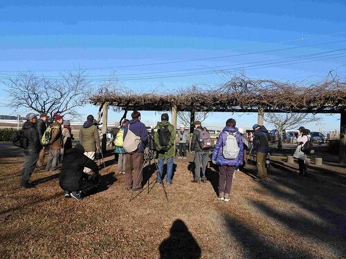 快晴の下、探鳥会に初めて参加という方を含めて13名様にご参集いただきました。(+幹事4名)お子さんも2名参加され、賑やかな探鳥会になりました。 金木橋下から車で小櫃川下流の船溜へ移動して観察開始です。 川で休息しているカモはカルガモがメインでし…